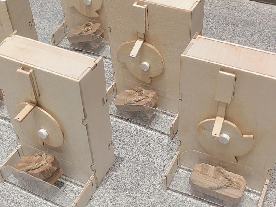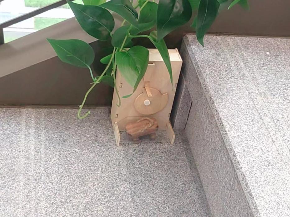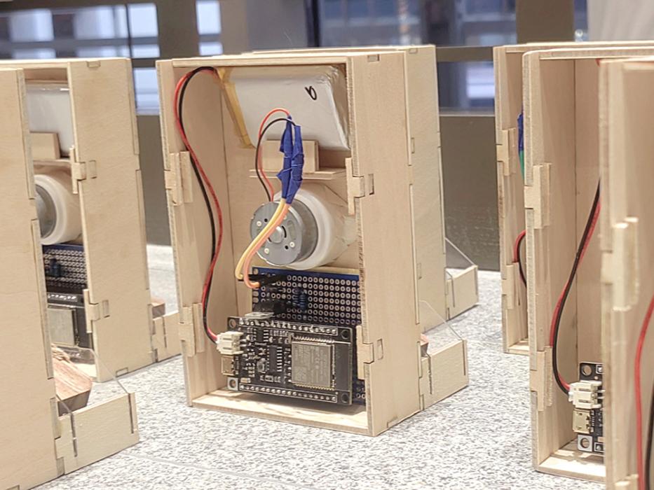 To authentically restore the naturalness and ordinariness of Yokai sounds, instead of sound synthesis technologies, the project applies primitive sound-making means to recreate the sounds. With a carefully designed kinetic mechanism using a motor, each sound device can produce the disyllabic sounds of wooden sandals and visually show the movement of walking. The whole installation consists of eight identical sound devices that are placed along a staircase. Computer vision technologies are applied to detect the number of people on the staircase and people's positions. When one walker is detected, as he/she walks down/up the stairs, sound devices are activated accordingly to create the auditory experience of being followed by the invisible footsteps monster.