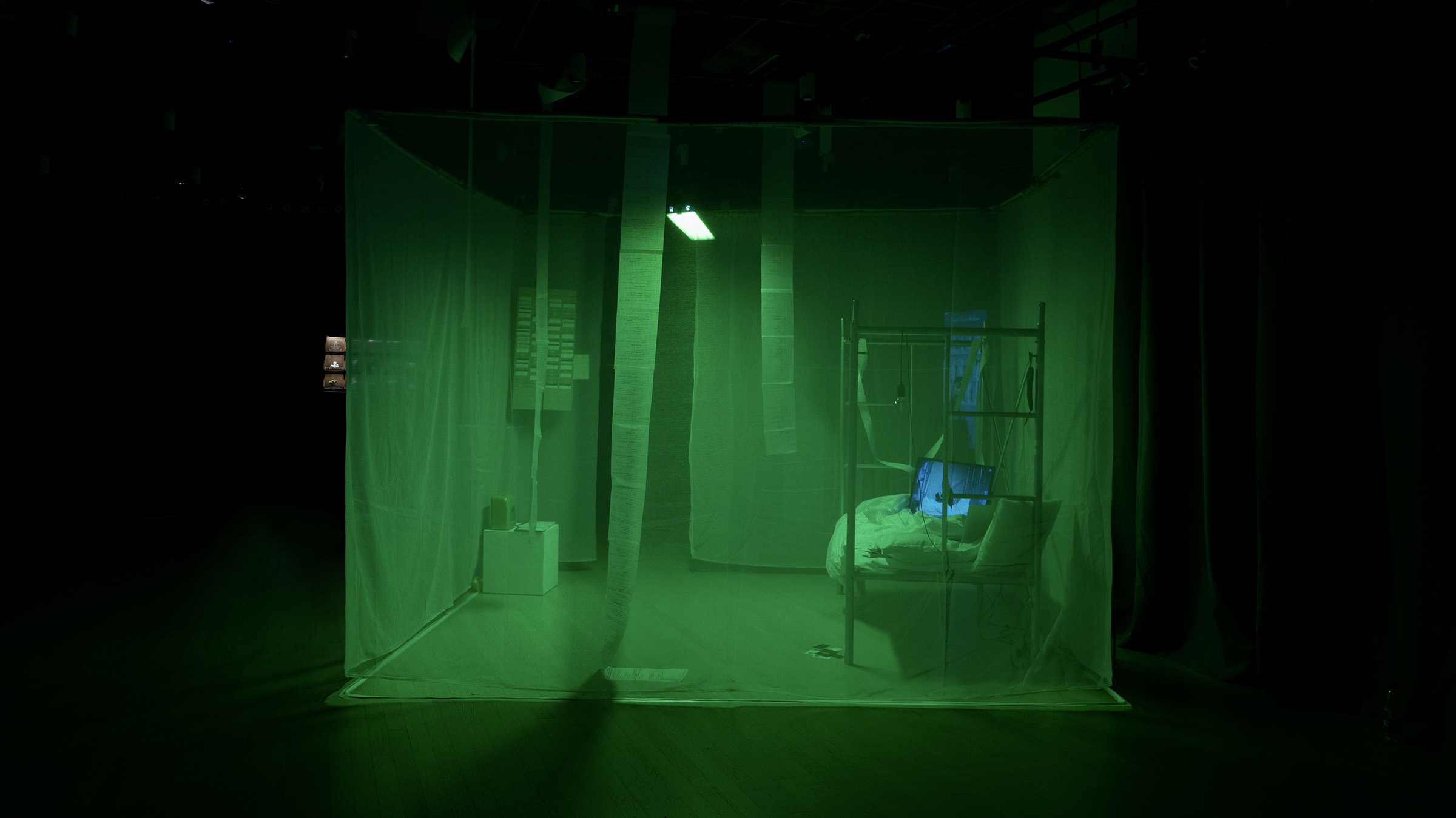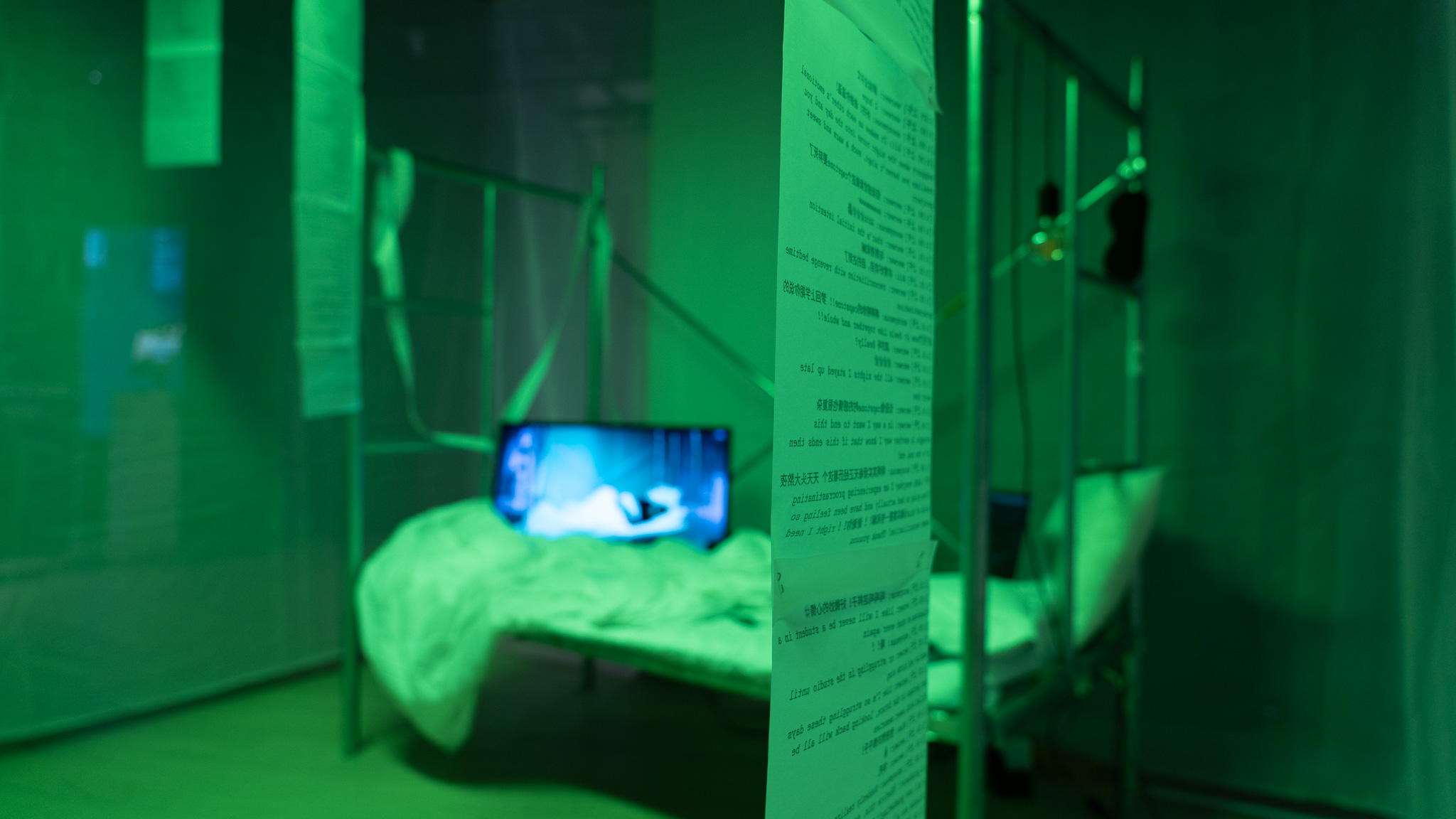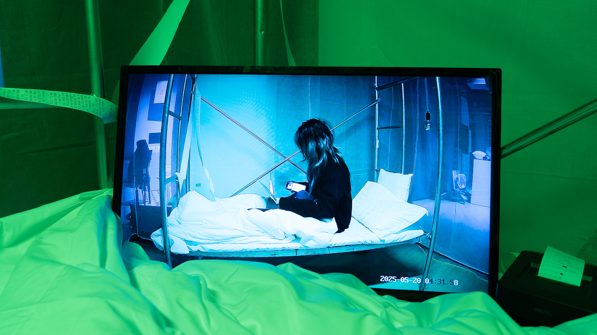 Through a scaffolded bed, a nocturnal chatroom connected to light and thermal printing, and a speculative clock-in system for sleep, the project constructs a world where even rest becomes regulated, monitored, and subtly extracted. A performance video documents the artist staying overnight within the system, tracing the blurred boundary between bodily exhaustion and algorithmic attention. Visitors are invited to enter the space, trigger its mechanisms, and experience how private time is fractured and repurposed under late capitalism. Within this architecture of control, the chatroom functions as a fragile opening—offering no escape, but perhaps a flicker of presence, connection, or even quiet revenge.
