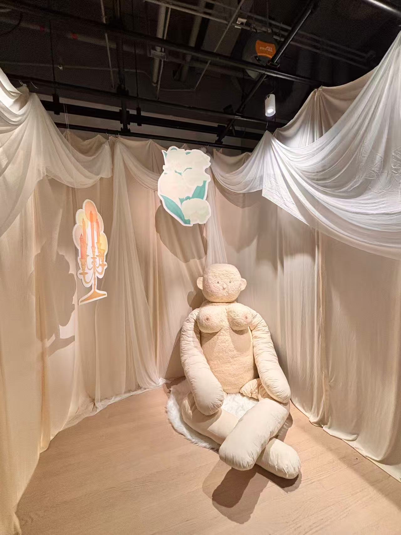 My Room is an immersive mixed-media installation that imagines a world where the female body is free from judgment, objectification, and scrutiny. In today’s media landscape—especially in China—women’s bodies are frequently sexualized and distorted under the influence of online beauty standards. Building on research from last semester on the representation of female bodies in China’s new media, My Room shifts the conversation from critique to imagination, offering a soft, speculative alternative.