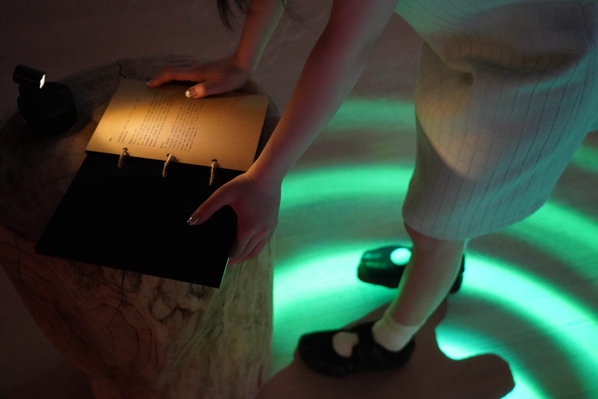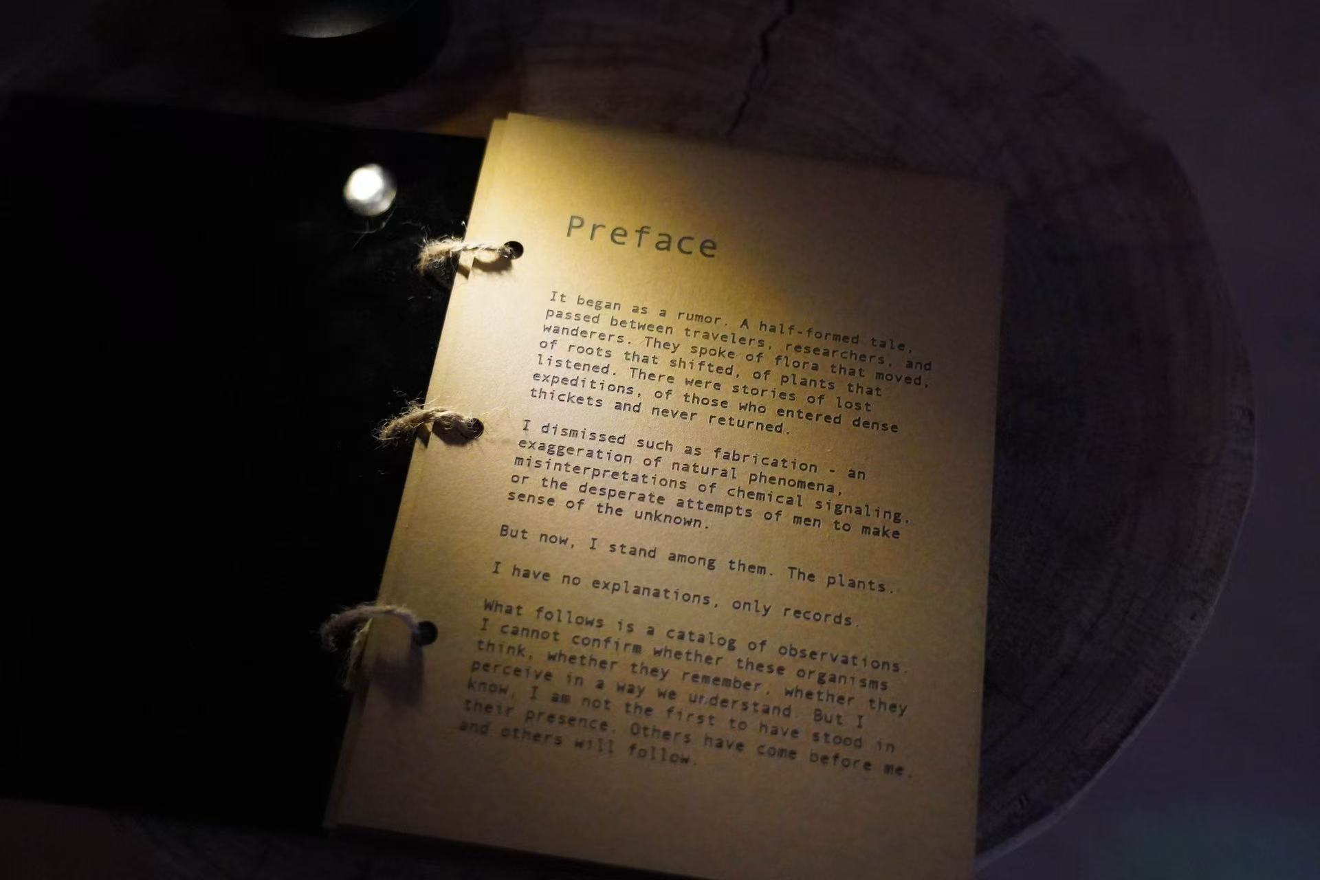 The installation comprises three interconnected components: a speculative codex, a sculptural entity, and a responsive environmental design. The speculative codex, presented as documentation authored by an imagined future researcher, creatively outlines plant species exhibiting extraordinary yet scientifically inspired behaviors drawn from real botanical phenomena, such as adaptive growth patterns, chemical signaling, and spatial memory. This element invites visitors into a speculative narrative context, establishing a conceptual framing that bridges scientific understanding with imaginative exploration. The sculptural entity, constructed meticulously from resin and PVC, serves as the tactile centerpiece of the installation, animated subtly by embedded Arduino-controlled water pumps. This physical form is situated within a responsive environment, where visitors’ movements trigger shifts in ambient lighting and visual patterns facilitated through a webcam and projection system. The installation’s aesthetics deliberately prioritize subtlety and ambiguity over immediacy, mirroring the slow, adaptive temporalities characteristic of plant perception, and encouraging visitors to adopt a more patient, reflective engagement with their surroundings.