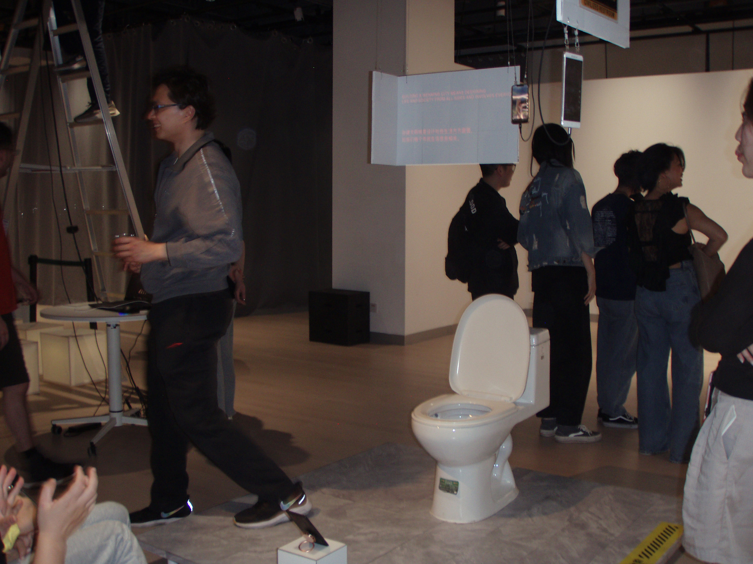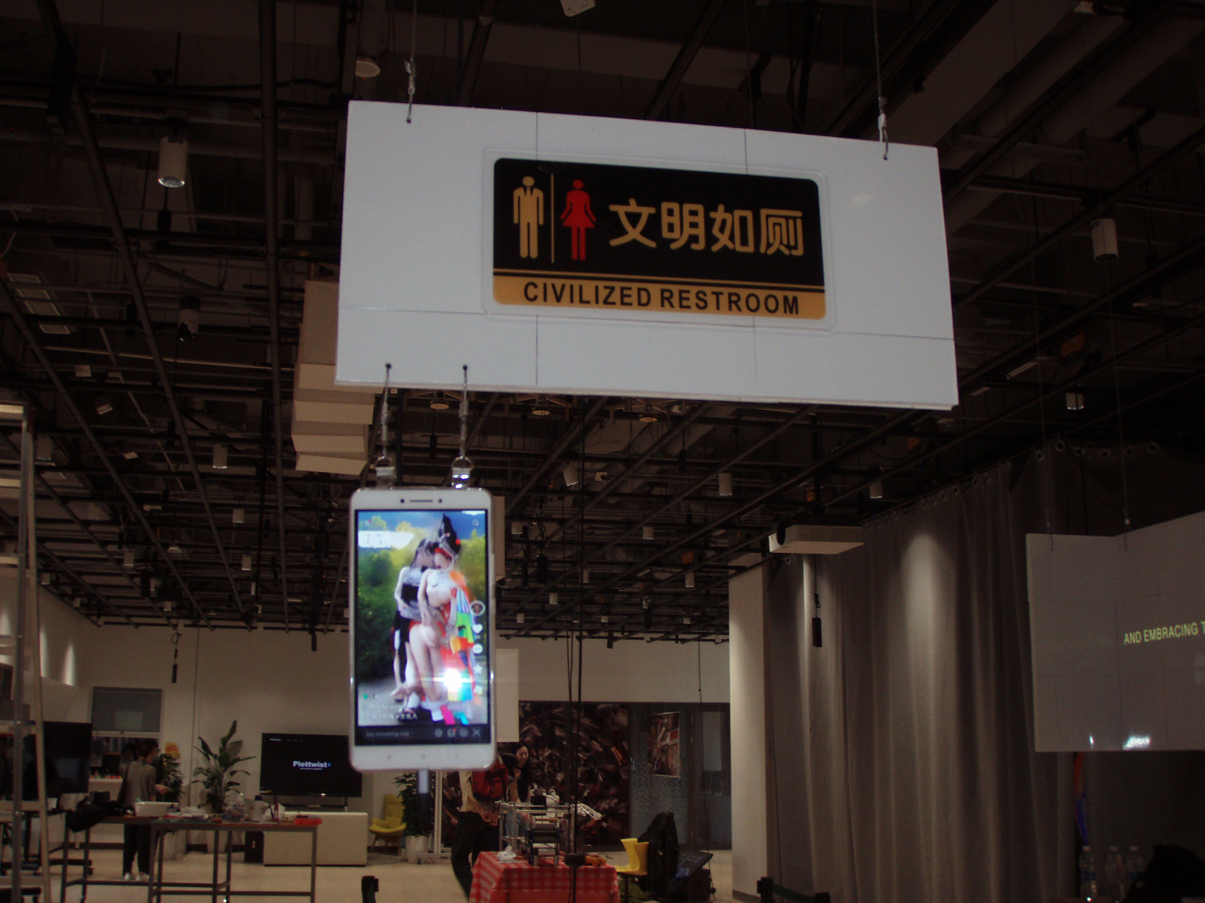 This audiovisual installation investigates Wenming, which translates to ‘civilization,’ ‘civilized,’ or ‘culture,’ as the interplay between identity, ethnicity, and digital space. While Wenming is often found in street signs, propaganda, and policy in the context of constructing a civilization by economic and technological means, Phoebe highlights how social media platforms like Kuaishou are sites for constructing ethnic identity and cultural authenticity, revealing a corporeal, intimate dimension of Wenming. Wenming works not only on the nation, state, and space but within citizens, bodies, and identities to fixate not ‘what’ is civilization, but ‘who’. Individuals are allowed to self civilize themselves so long as they fit within within the bounds of a racialized, gendered, and orientalized Other. Her building of a public restroom, a pinnacle of Wenming in modern urban space, combines a daily act of corporeal vulnerability with re-imagined Kuaishou videos generated through machine learning to highlight Wenming as a pervasive force that must be understood through its merging of on and offline structures of power and the self. The installation’s integration of a soundscape created through layered tracks of real Kuaishou videos also aims to recreate what it means to behave, consume, and be Wenming in acts of our every day.
