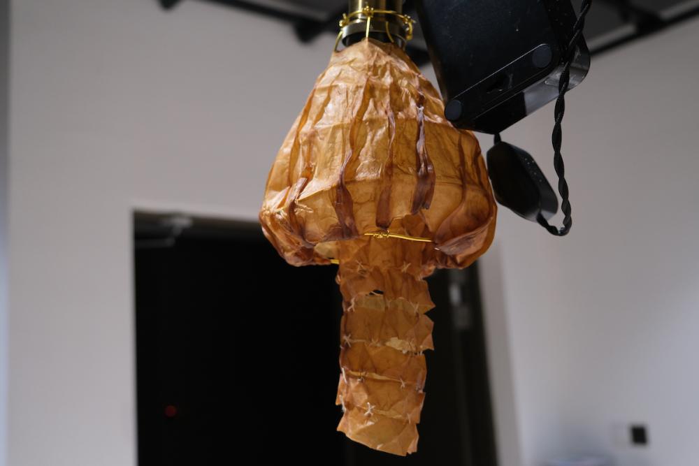 The project consists of 4 parts: Experimentation, Design, Live SCOBY, and Photos. Each part provides a different sensual experience and connection with the material. Altogether, the senses of touch, sight, and smell come together to show the possibility of a world where bio-materials such as SCOBY can become functional, practical products in everyday life. All of the experimentation, lampshade development, display construction with industrial accents, and growing of the SCOBY were done by hand using majority natural materials, keeping with the key principles of Arts and Crafts. The lampshade itself boasts a mushroom shape, which is also in line with the Arts and Crafts principle of including nature motifs in designs. The images displayed show the textures of SCOBY in different phases of drying to highlight the changes in texture and form the material takes on.