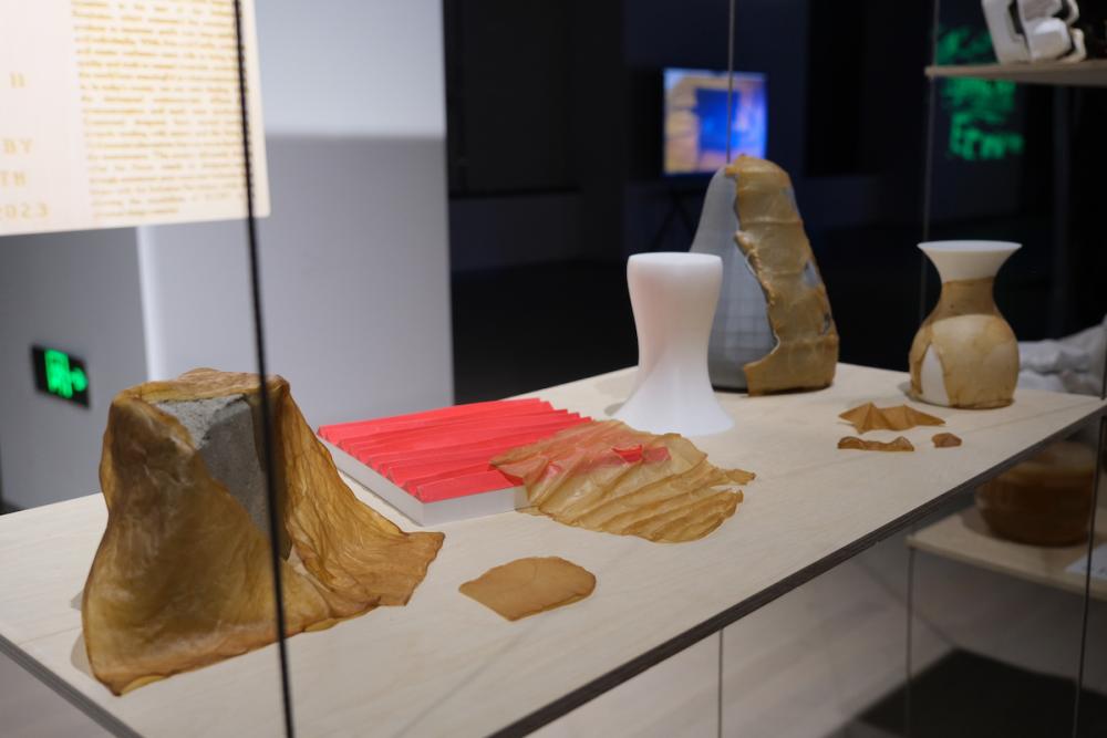 “Forming with the Living” is a combination of the futuristic practice of bio-design and the 19-20th century Arts and Crafts Movement, showcased through experimenting with SCOBY as a material with Arts and Crafts design characteristics. The display boasts a sensory experience composed of sight, touch, and smell to foster a deep connection to SCOBY and increase awareness of the future of bio-design.