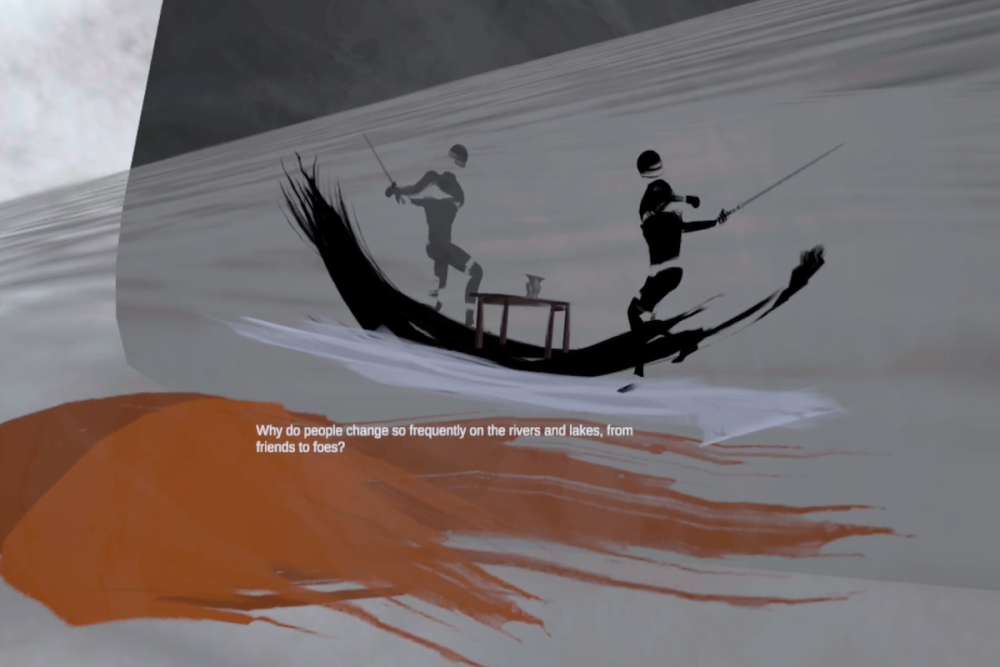 This project utilizes the technology of Virtual Reality to materialize and introduce the different interpretations of the Chinese concept “jianghu” (江湖). It is inspired by the transposing representations and multiple dimensions of interpretations of the text “jianghu ”. It is one word that carries much philosophical thinking and describes social conditions. The interpretation of this word originates from the Daoist discussion by Zhuangzi of spiritual liberation and individual freedom. It later spans the genre of Chinese martial arts (Wuxia) novels depicting the netherworld of misfits who rejected systems of authority. In modern times, it is used to describe the paradoxical side of relationships within societies. It portrays how different perspectives can lead to different interpretations, and how different dimensions of thinking can lead to various media representations. These features of Jianghu align with many characteristics of the VR technology that allows for connecting different dimensions of worlds and different perspectives together. So far, many projects have focused on one aspect among the multiple transposing interpretations of jianghu. But little attention has been put to the introduction about the connections between the philosophical, ethnical, and aesthetic aspects of these different representations. Thus, in this project, I utilize Virtual Reality to materialize and introduce the different dimensions of the concept “jianghu” (江湖).