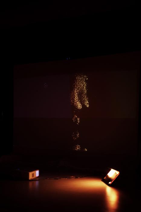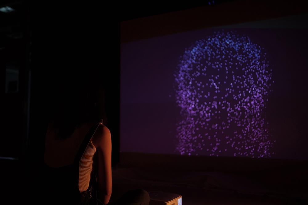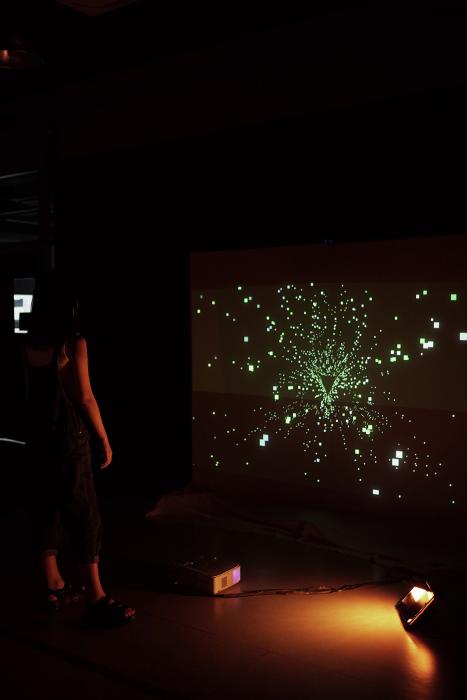 In this interactive video installation, the audience is provided with a private and meditative space that is in the middle of the real and the virtual. Upon walking into the space, the audience would encounter their virtual self. By absorbing the particles in the virtual space through body movements, the virtual avatar of the audience gradually becomes brighter, indicating the completeness of their self identity. In the final scene, the audience would enter an unrealistic universe that changes rapidly, which is a metaphor of the transient virtual environments people travel between through a variety of media. All of the visuals are built up purely by particles. The movement of particles seems simple, but it has its own power in that particles are the units that our world is made up of. The aesthetics of the visuals in this project is abstract and minimal, leaving the audience with more space to relate and imagine.