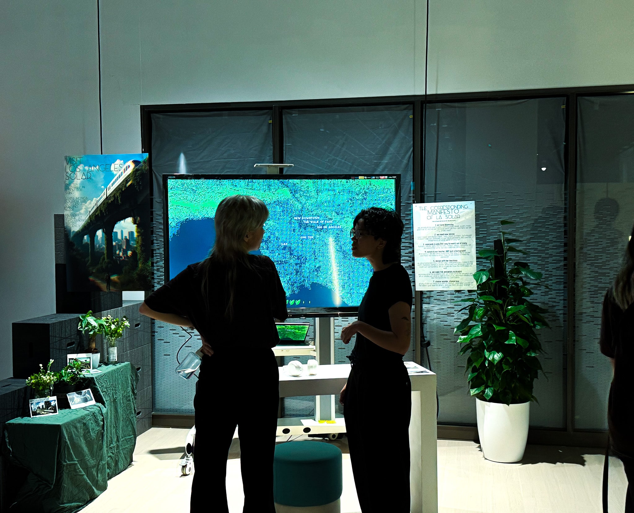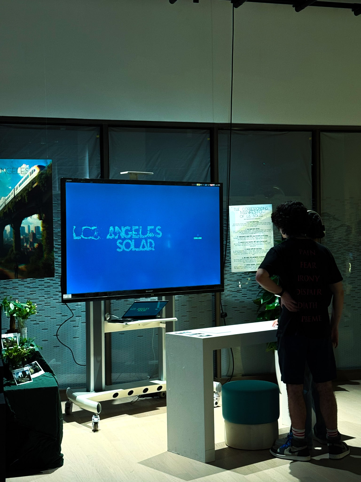 Through an interactive, narrative driven website centered around a map of Los Angeles, users explore iconic locations transformed by sustainable energies, green technologies, regenerative urban design, and respect of ecological balance. The story unfolds through short textual segments across the map and each individual location. The map itself uses a particle system with topographic data of the city that follow an offset tracked to mouse position, making the interactions subtle, natural, and responsive. Clicking and expanding into each location reveals an AI generated image that followed a detailed generation and post production process, including using real photos of the city as reference, to produce results most accurate to the story. Each image has a corresponding custom painted depth map that, paired with Three.JS, produces a perspective distortion effect mapped to mouse position. Real photos from each corresponding location are also embedded within each, so a comparison is available. Everything combined with environmental sound design contributes to a more holistic environment for the viewer. The experience culminates in a single global yes/no poll, asking whether or not that individual believes that this future can exist, or not. In this way, Los Angeles Solar is an evolving conversation, and changes with the growing minds of its own users.