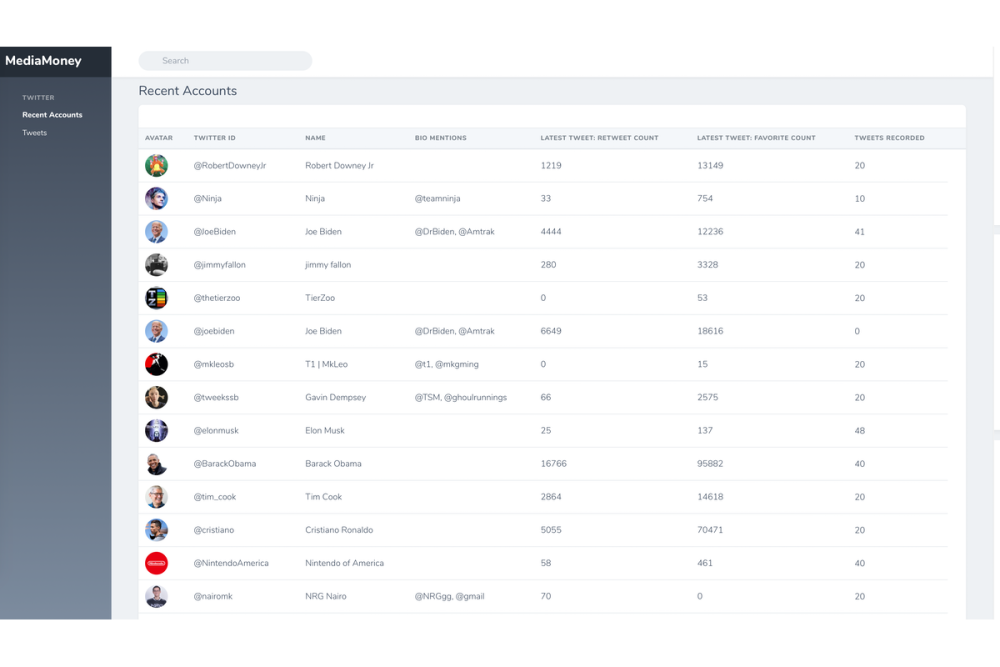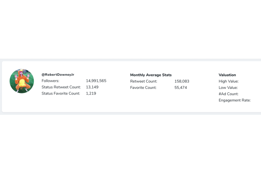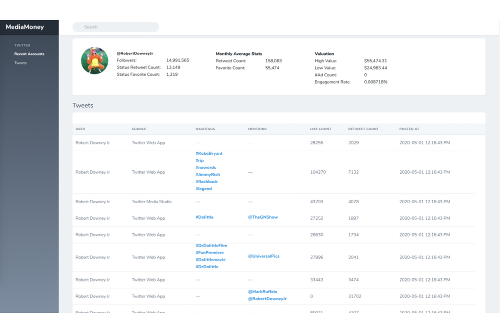 For example, a user viewing a viral Robert Downey Jr. tweet in their timeline now has options. He or she can simply search RobertDowneyJr on the MediaMoney website and pull up relevant statistics. MediaMoney will display a myriad of information ranging from how many likes per Tweet the famous actor receives to a dollar range of how much advertisers might pay him for a sponsored tweet.