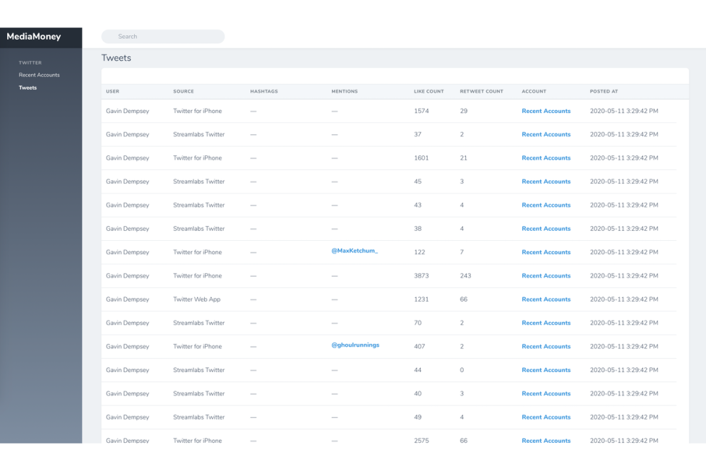 Built using common web development standards, MediaMoney sources its data directly from Twitter. Thus, the site is freely and easily accessible from any computer with a web browser. Furthermore, because the data MediaMoney uses comes directly from Twitter, it is highly accurate and trustworthy. The website then applies a custom model onto that data to estimate potential earnings from advertising. Our model was built carefully to ensure accuracy for its users.