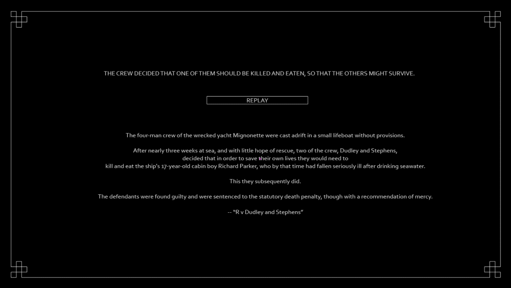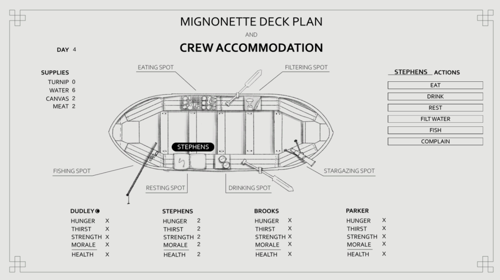 On Mignonette is an exploration of game mechanics and moral emotions. After a terrible storm, the crew of The Mignonette found themselves on a lifeboat with only a pitifully small amount of supplies. The desperate situation prompted a possible solution: make one of the crew members food for the others. What would they do in the face of this dilemma? Who would suggest such a thing? How would they decide who should be sacrificed? This work is based on a true story.