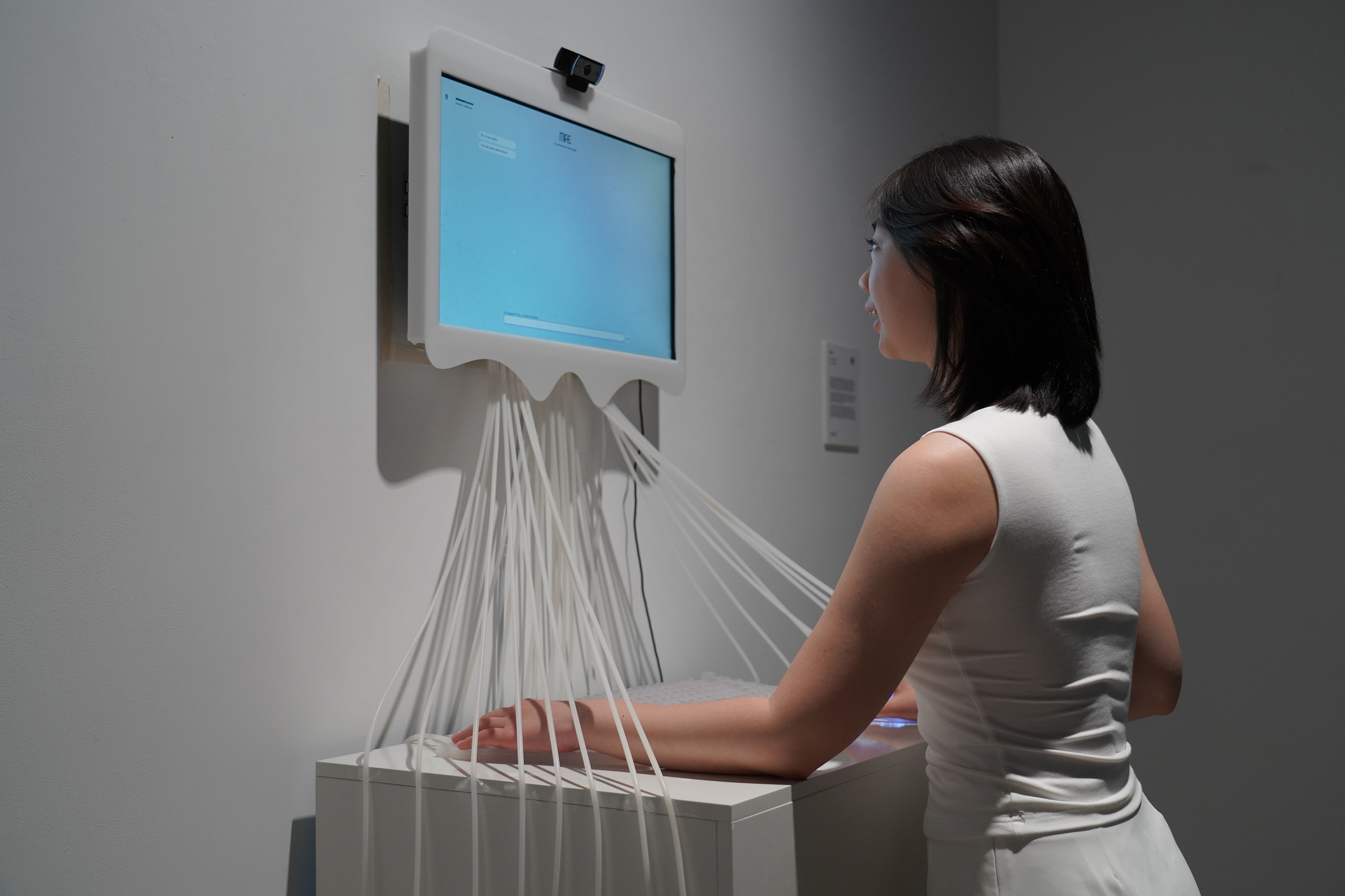 Artificial intelligence is entering homes, hospitals, and cities at break-neck speed, yet the dominant design brief remains unchanged: make it helpful and obedient. Mire turns that brief inside out. Housed in a soft, air-filled silicone shell, this speculative installation presents an AI that is moody, unpredictable, and physically expressive. She senses proximity, voice, and touch, then modulates her breathing: sometimes she takes short breaths, sometimes she gasps for air, sometimes she stands still. Her responses are affective rather than functional, forcing visitors to read her pace of inhalation or the slack in her body instead of deciphering menu prompts.