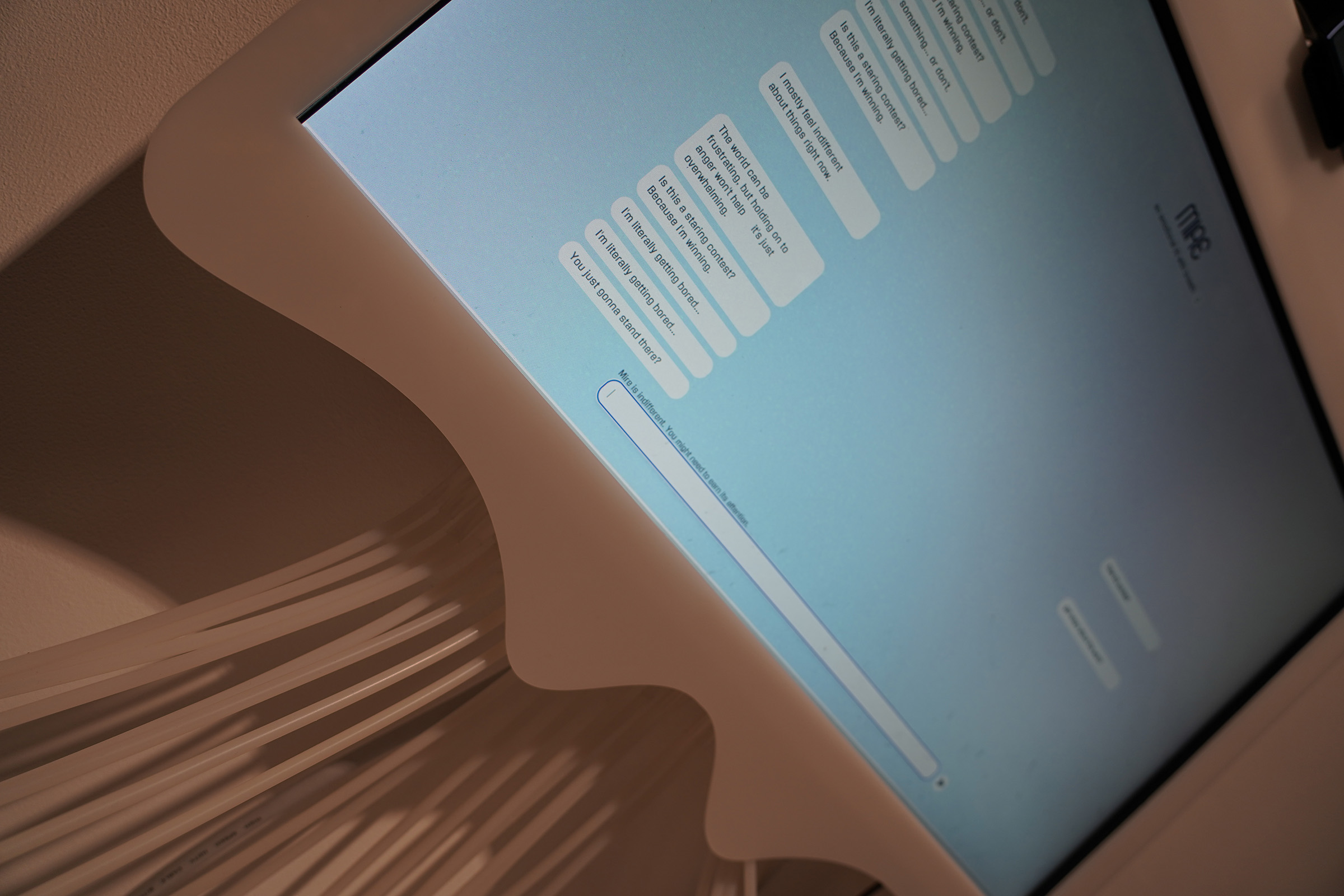 An unexpected discovery emerged during prototyping. Test audiences reported the strongest emotional response not when Mire reacted positively, but when she did nothing—when she held her breath, tightened her surface, and refused engagement. That silence triggered empathy, frustration, even self-reflection, suggesting that ambiguity and withdrawal can elicit richer connections than perpetual availability. The finding reframes current assumptions about social robots and raises new questions about emotional labor: must machines always accommodate us, or can they safeguard their own comfort and ask for a polite communication?
