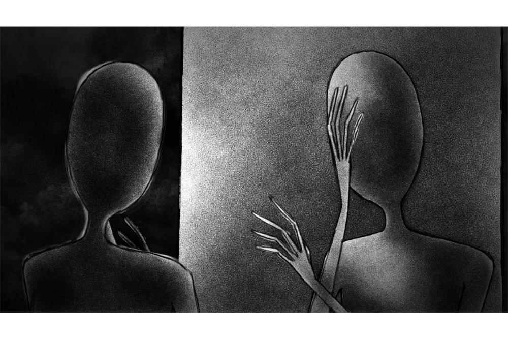 In my depiction, I let my character experience harsh criticism towards his/her self to show how extreme self-criticism can lead to strong depressed feelings. When I was struck by the anguish of criticism, the inner struggle was hard to convey verbally but I perceived it in a visual form. In this project, I turned my visions into a film to convey this chaotic inner state. The black and white visual style fits in the dark tone of the story. There are two conflicting parts inside the character: one part of the character does self-criticism, while the other tries to resist it. The conflict between the two parts is translated into the action of consuming and fighting between a figure outside the mirror and his/her reflection. The figures in my film don’t have distinguished characteristics as I intend to present the self-criticism concept in a universal way. The character can be understood as every person so that audiences can project their feelings onto the film character. The usage of a mirror in the film is inspired by Jacques Lacan’s concept of the mirror stage. As a mirror can reveal the psychological state, in the film, the mirror serves as a trigger for the process of self-criticism.