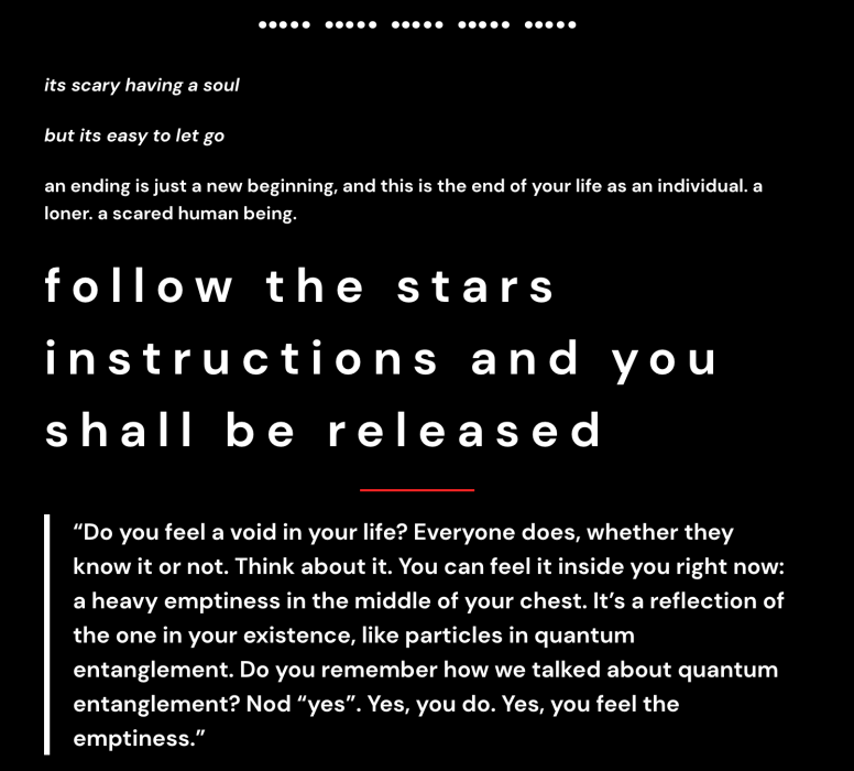 Inspired by the SCP story of the same name, Star Signals the ARG follows Vi, a grad student visiting NYU Shanghai, who documents her increasingly strange experience living in Shanghai during the 2022 COVID lockdowns. Her Twitter and Instagram updates paint an unnerving situation wrapped in secrecy and otherworldly influence. Vi has enlisted the help of her followers to the bottom of this rabbit hole. Eventually, this leads up to a final message; a website she’s created to expose those responsible for the disappearance of a NYUSH professor. While also including specific instructions for those wholly devoted to fighting for their right to “become one with the stars”. But this doesn’t mean all secrets have been revealed. This ARG is still active even though Vi might be on the run.