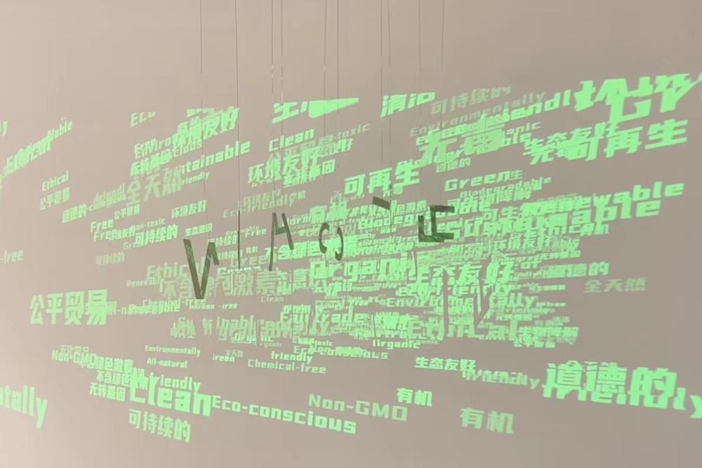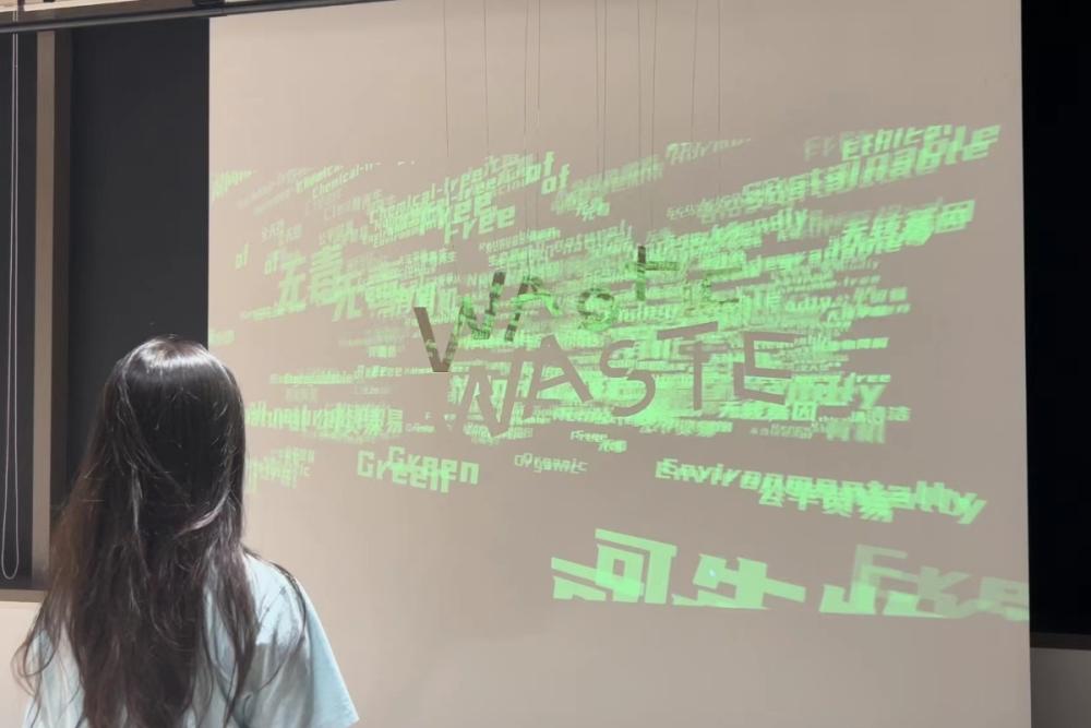 The installation comprises ten meticulously crafted fabrications suspended against a white wall, with moving words commonly used in greenwashing projected onto it. Initially, only the green sustainable words are visible, symbolizing the industry's superficial promises. However, upon closer inspection, the words disappear, exposing the stark contrast between sustainable claims and actual impact. By combining Shadow Art and Physical Computing, "Shadow Behind" creates an immersive experience that prompts profound introspection. What sets "Shadow Behind" apart is its fusion of art, technology, and critical inquiry to confront the issue of greenwashing head-on. It challenges viewers to question the practices of the fast fashion industry and reflect on the broader consequences of their consumption choices. The captivating display and interactive nature of the project aim to raise awareness, foster critical thinking, and inspire a shift towards more sustainable behaviors. By promoting an informed and responsible approach to green advertising, "Shadow Behind" empowers individuals and seeks positive change within the fashion industry.