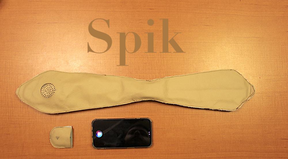 Spik is an assistive wearable device designed to aid people who experience difficulties using their phone due to movement dissorders. The idea for the device came from observing and conducting interviews with an individual who has Parkinson's disease. The user faces several challenges when using his phone and cannot make calls independently. Spik is a device that hangs from the user's shoulder and serve as an interface for making phone calls. The device includes a wireless button that rests in an easily accessible area for the user's hand. When the button is pressed, Siri on the user's phone is triggered, and the user is able to request who they want to call or any other necessary Siri command. The device connects to the user's phone, and the speaker and microphone on the device acts as the interface for the phone call being streamed from the phone. The battery in the device can last over a day if used only for phone calls and the battery in the controller last around one year according to the manufacturer. Spik is cased on a genuine leather body and was designed based on the user's preference and suggestions.