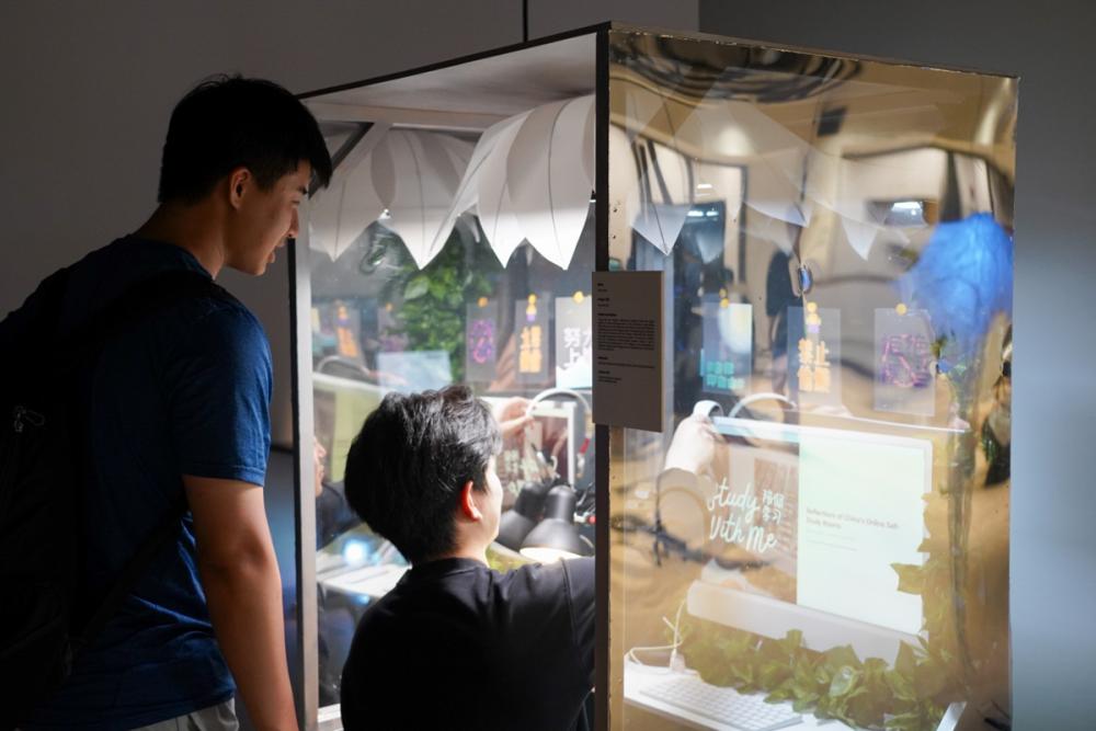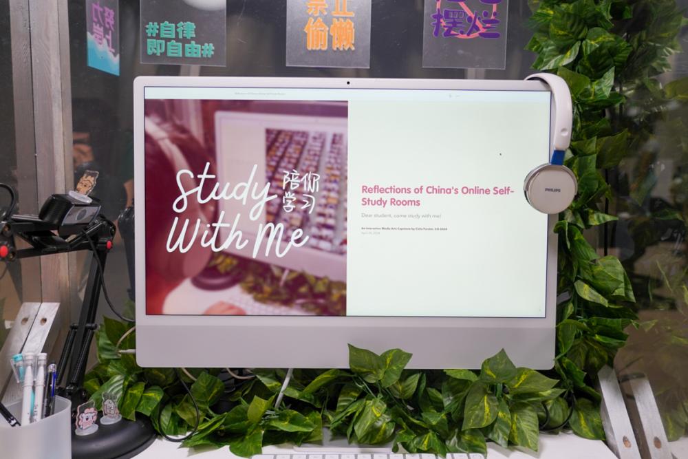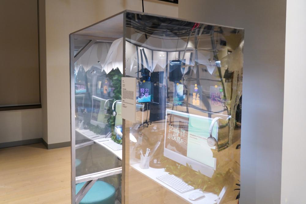 Study With Me is an interactive installation exploring reflections of diligence within the digital confines of online self-study rooms (线上自习室) in China. Blending structural rigor with the engaging aesthetics seen on popular platforms like Bilibili, this project reimagines the narratives of surveillance and mechanical labor prevalent in Chinese digital academic culture. Self-study rooms, often seen as both a symptom and a remedy to the pressures of 'neijuan' (involution), offer a paradoxical refuge from and reinforcement of intense academic competition. Here, students and young adults find solace in the discipline and communal support needed to achieve their educational goals. The installation features a study cubicle equipped with one-way mirrored panels, embodying the gaze of the unknown observer in the digital space. This setting allows users to simultaneously engage in and reflect on the act of studying, thus experiencing firsthand the phenomenon of "study" as both a physical and conceptual space. The design incorporates elements that resonate with the heritage of high-stakes academic environments, drawing on the structure of imperial examination cells, balanced with the modern aesthetics that make up Chinese digital study culture. Details such as a carpeted floor, a handmade lotus flower lampshade, and motivational phrases commonly found in study spaces enrich the experience, creating a blend of intensity and coziness. Sitting on the desk, users will find a Mac computer, a nod to the 'Study With Me' genre’s iconic imagery, which hosts an interactive StoryMaps-based narrative. This story leads users through an audiovisual journey exploring the history and evolution of self-study rooms, interspersed with live feeds of the participants in the cubicle. This design encourages a reflective dialogue on diligence, challenging participants to confront their own perspectives and share messages of encouragement with others. Study With Me combines historical elements with contemporary digital aesthetics, creating a unique experiential learning environment that encourages personal introspection and communal exchange. It not only showcases the challenges faced by learners but also celebrates their resilience and adaptability, offering a novel perspective on navigating the pressures of educational environments today, in China, and beyond.