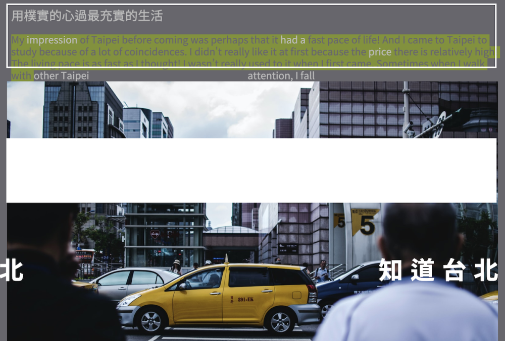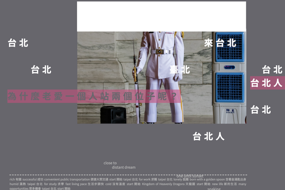 Moving to Taipei is just like creating easure poems; entering Taipei, assimilating society’s customs and vibe, and finally redefine what it is to be a Taipeier, the experience of accommodating to a large, new city is conceptually aligned with both the technical and poetic process of erasure poetry—a text being encountered, read, and then “partially erased” in forming new interpretations of an existing narrative. By translating and erasing the collected stories, Wu used the erasure form as a personal self-reflection of her relationship with her hometown Taipei. She decided that making this into an interactive website would further enhance people’s engagement with the text, that the memories and experiences can be carried on with newly added layers of people’s own interpretations of Taipei. On the website, viewers could select texts to either reveal the original stories or make their own erasures. This is an extended spirit of the story providers and the artist, and an ever-expanding social practice and influence. These concepts are visually mapped out on the website, with juxtaposing texts crossing and overlaying each other. The diverse yet homogenized complexity of these “stereotypes” and “dreams” have to deal with the dynamic between collectivism and individualism.