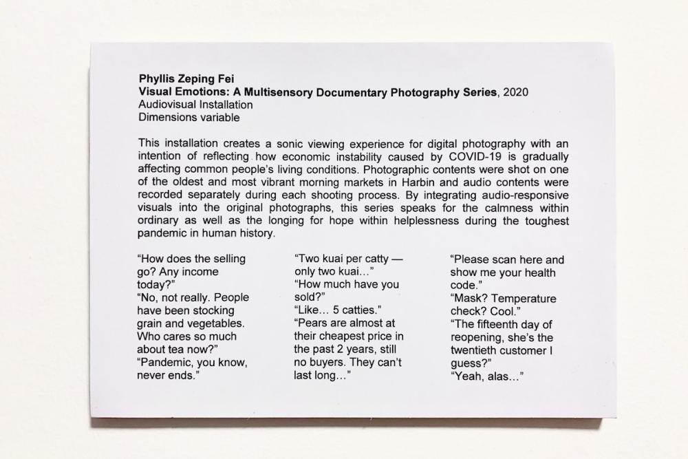 This project fuses the two senses to embody personal emotional resonance, a response to how economic instability caused by COVID-19 has impacted common people’s living conditions. The audio clips reveal conversations about the immediate conditions in the market. Through diminished levels of market activity that can be experienced in both sensory media, the audience feels the implications of the situation. This project speaks for the calmness within the ordinary as well as the longing for hope within helplessness during the toughest time in human history.