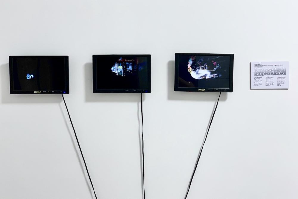 The audio clips, which can be heard by the viewer through headphones located near each photograph, are processed into frequency spectra, and the size and range of the spectra are manipulated in Touchdesigner with multiple mathematical algorithms. These audio data outputs affect positions, colors, brightness and sizes of the pixels in the rendered photos displayed on 25.0 cm x 16.5 cm screens mounted at eye-level. By engaging both visual and auditory sensations from the audience, this project proposes an alternative display for photographic works and aims at opening up space for imagination and interpretation.